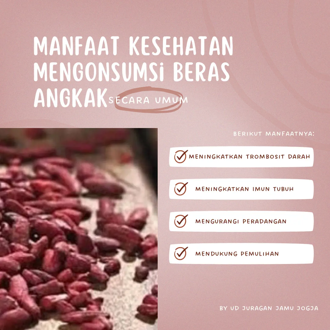 Beras angkak adalah varietas beras unik yang tumbuh di wilayah Asia Tenggara, khususnya di Indonesia, Malaysia, dan Thailand. Beras ini dikenal karena kandungan zat warnanya yang khas, yaitu antosianin. Selain itu, beras angkak juga memiliki manfaat kesehatan yang luar biasa, termasuk untuk mengatasi beragam penyakit. Diantaranya :