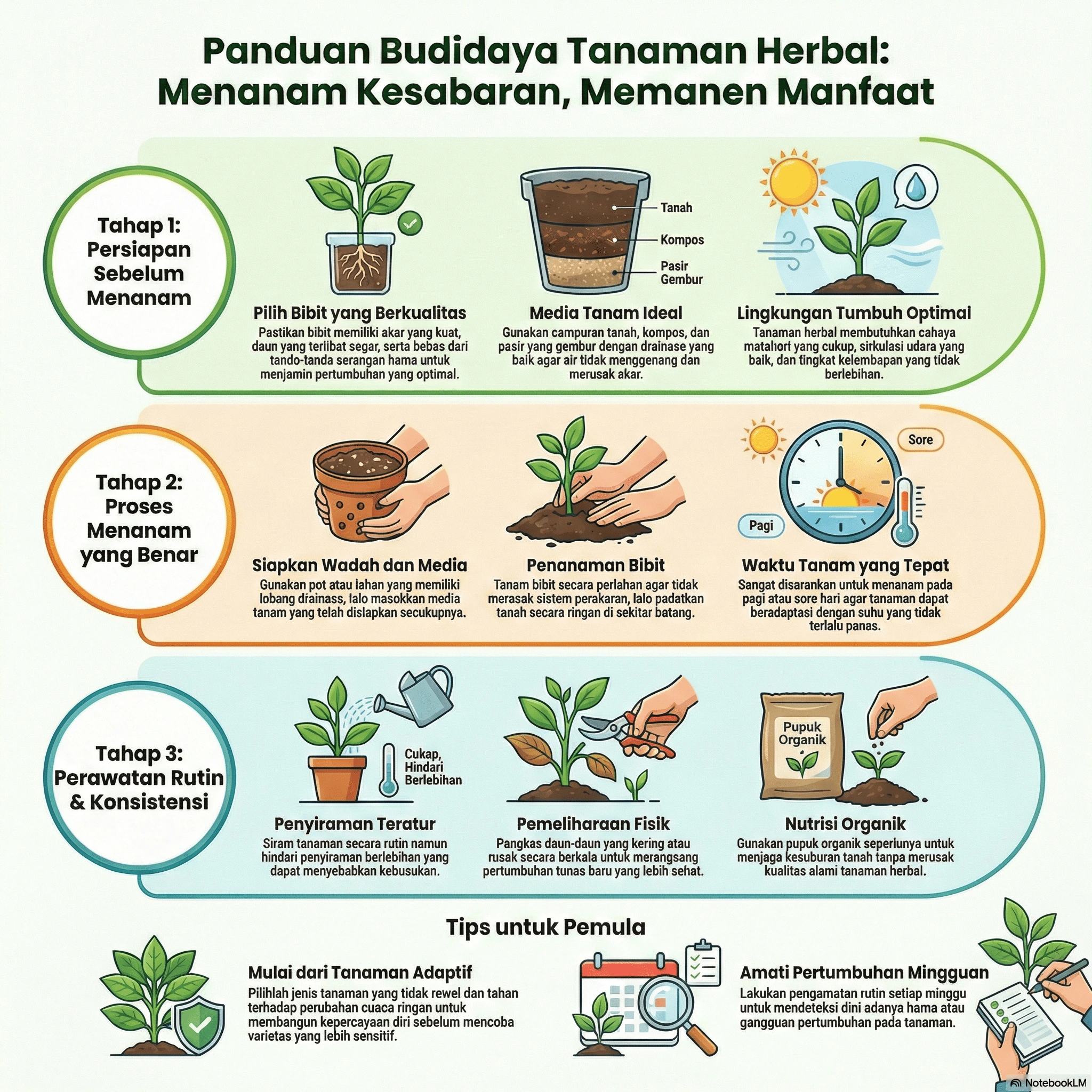 Panduan budidaya tanaman herbal ini tidak menjanjikan hasil instan. Yang ditawarkan adalah pemahaman, ketenangan, dan proses yang berkelanjutan. Jika Anda menanam dengan sabar, merawat dengan perhatian, dan belajar dari setiap tahap, hasil akan datang pada waktunya.