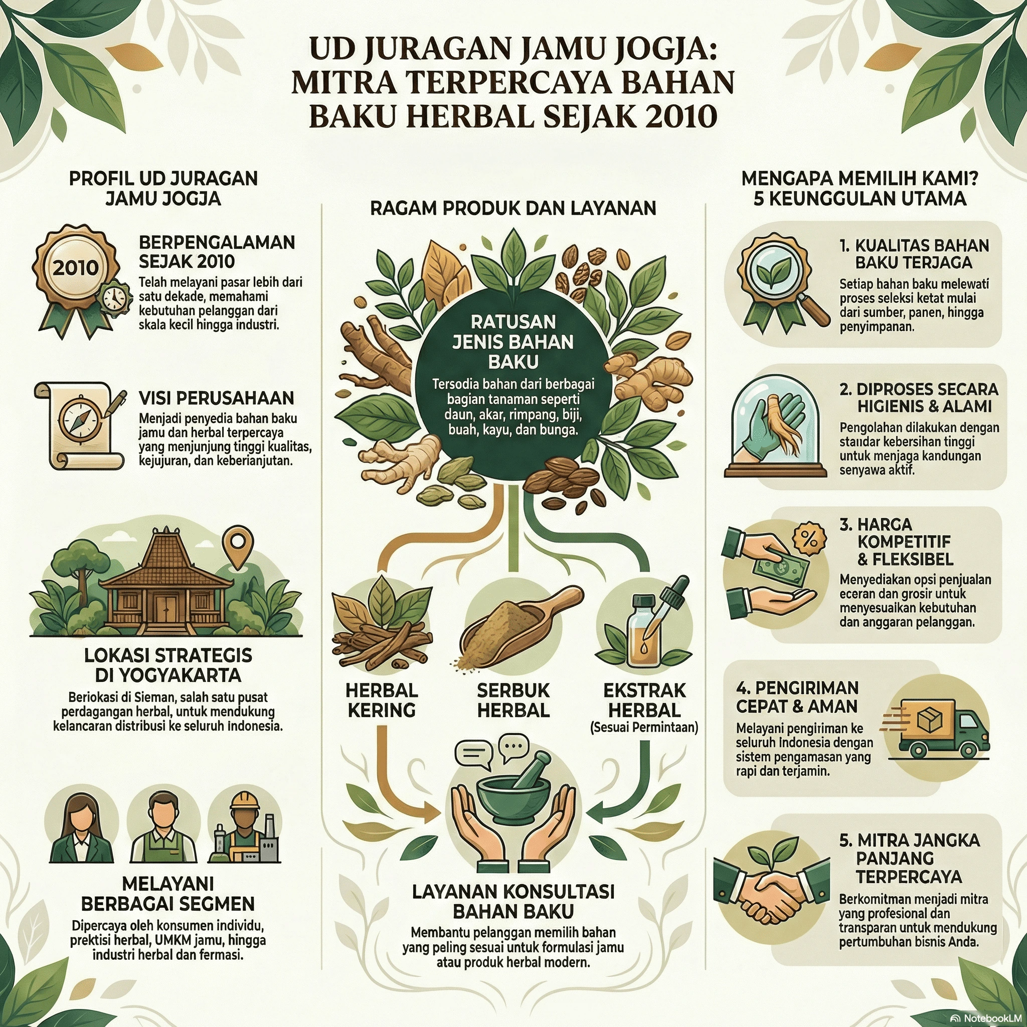 UD Juragan Jamu Jogja adalah mitra terpercaya dalam penyediaan bahan baku jamu dan herbal berkualitas. Dengan pengalaman sejak 2010, kualitas produk yang terjaga, harga kompetitif, serta pelayanan profesional, UD Juragan Jamu siap memenuhi kebutuhan bahan baku herbal untuk konsumsi pribadi, UMKM, klinik herbal, hingga industri jamu dan farmasi.